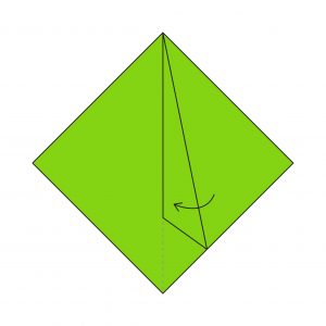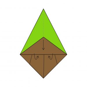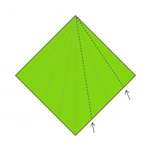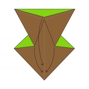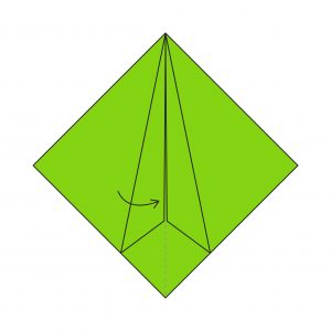 20) You’re now forming the base; fold the bottom point (one layer) upwards along the dotted line.