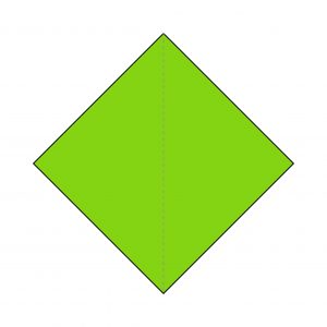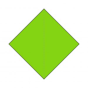 1) Start with a piece of origami paper as shown, green side facing up. Fold in half vertically, horizontally and diagonally.