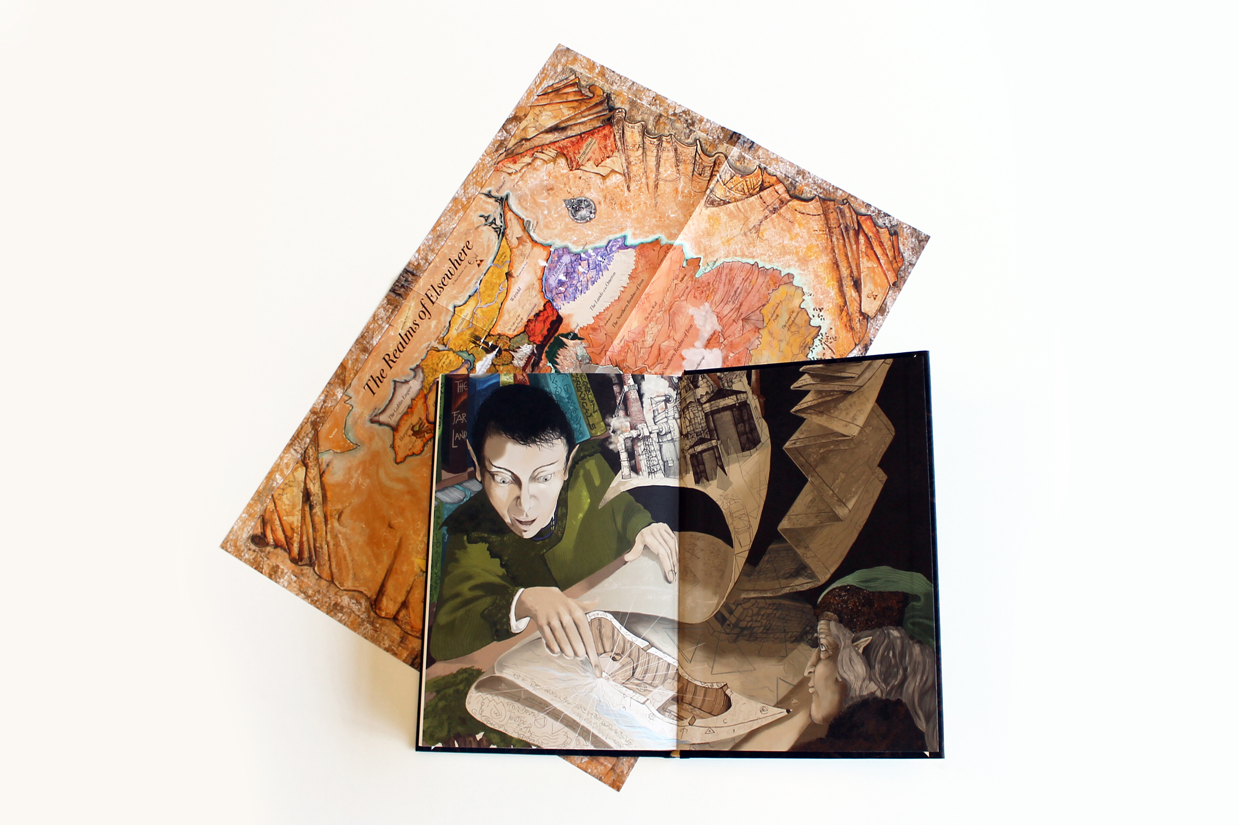 The book was hardback bound with foil ‘New Penny Copper’ applied to the front cover. The book also included printed endpapers and a large-scale ‘The Realms of Elsewhere’ map, which we carefully hand-inserted into the back of each copy.